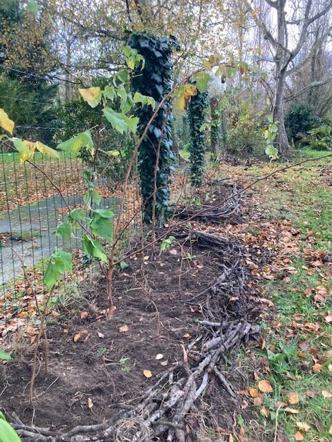 En novembre, la maîtresse du jardin accepte l’idée d’une plate bande supplémentaire avec des framboisiers (production maison) dans un sol ensoleillé et frais. Histoire de régaler petits et grands enfants en début d’été. Le futur endroit de la plantation est couvert, quelques semaines plus tôt, de résidus de taille de végétaux variés. Nul n’est alors besoin de désherber, ou si peu, pour préparer la terre. Puis, une fois les framboisiers plantés, un entourage de branches de figuier taillées quelques semaines plus tôt, fait office de bordure façon plessis. Rien de plus économique et écologique. Dans quelques jours, du BRF sera déposé en guise de couverture pour l’hiver.